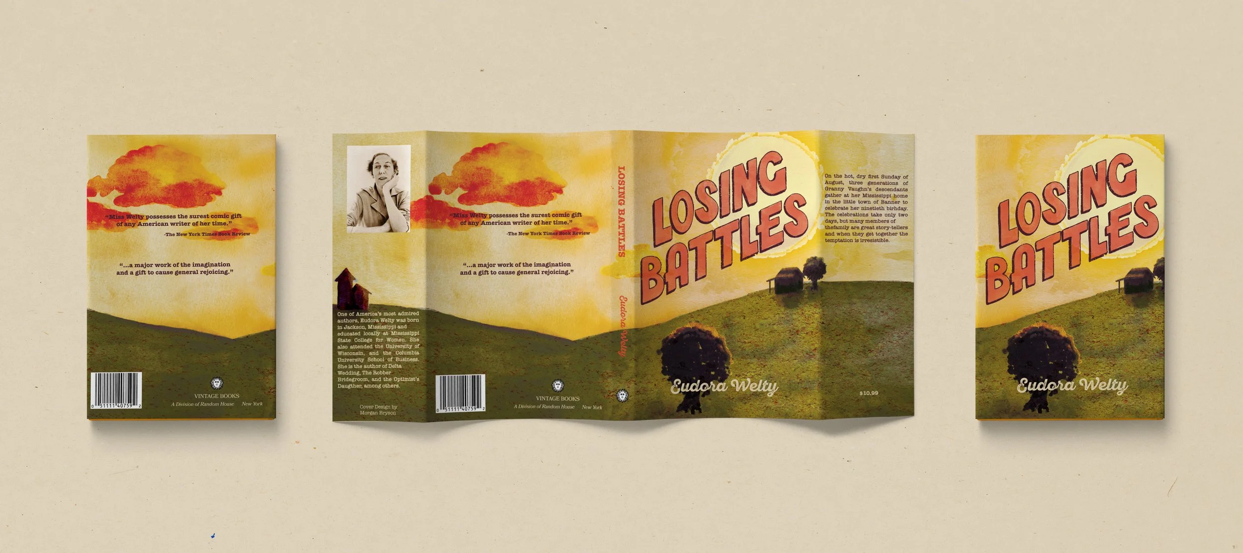 This was a cover redesign for Losing Battles by Eudora Welty. It’s set on a struggling farm in hill country Mississippi in the 1930s. A large family reunion is taking place and they all sit around swapping stories.